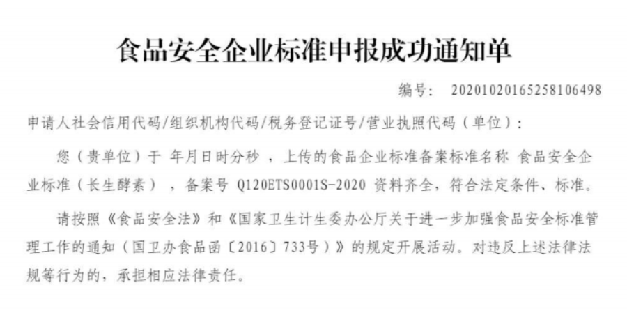 2020年長(zhǎng)生酵素獲得食品安全企業(yè)標(biāo)準(zhǔn)備案