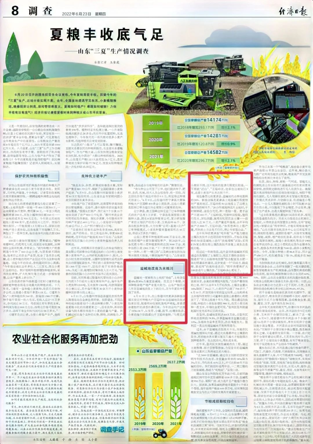 6月23日,《經濟日報》8版刊發(fā)《夏糧豐收底氣足——山東“三夏”生產情況調查》,其中對夏津“鹽堿地改良為米糧川”進行了報道。內容如下: