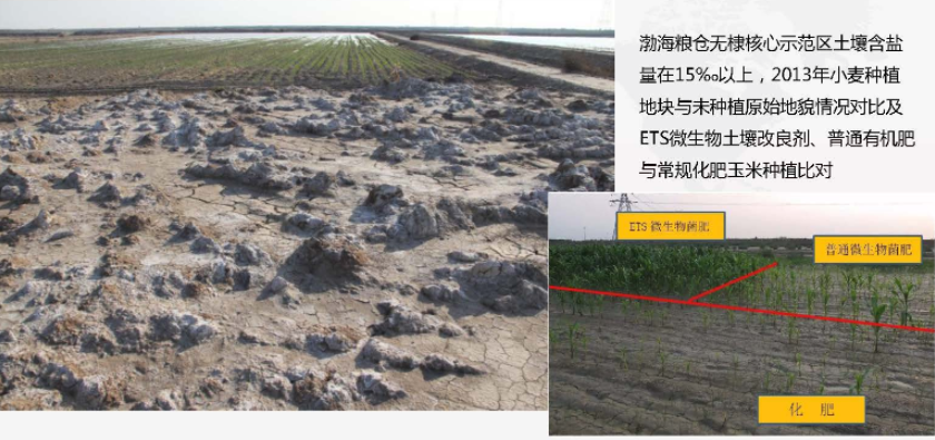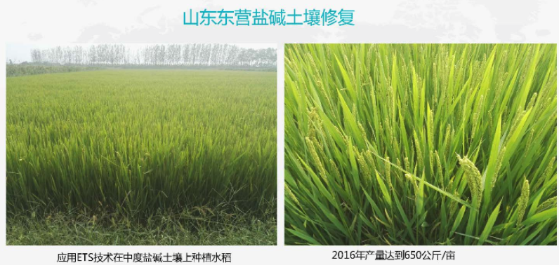 ◆ETS鹽堿地土壤修復(fù)技術(shù)已在國(guó)家科技部十二五科技支撐計(jì)劃“渤海糧倉(cāng)科技示范工程”中作為關(guān)鍵共性技術(shù)在山東黃三角地區(qū)鹽堿地上大面積推廣。目前已經(jīng)治理鹽堿地總面積130.7萬(wàn)畝,新增糧食生產(chǎn)能力5.2億公斤。